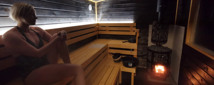 Alueelta löytyy kolme saunaa: sähkösauna, puusauna ja maisemasauna. Yleinen saunavuoro sisältyy alueella majoittuvien majoitushintaan joka lauantai. Saunoja vuokrataan asukkaiden lisäksi myös vierailijoille, kysy lisää!